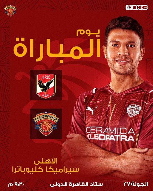 يلتقي الأهلي، مع سيراميكا كليوباترا في التاسعة والنصف مساء اليوم، الأثنين، على استاد القاهرة، والمؤجلة من الجولة السابعة والعشرين لبطولة الدوري.