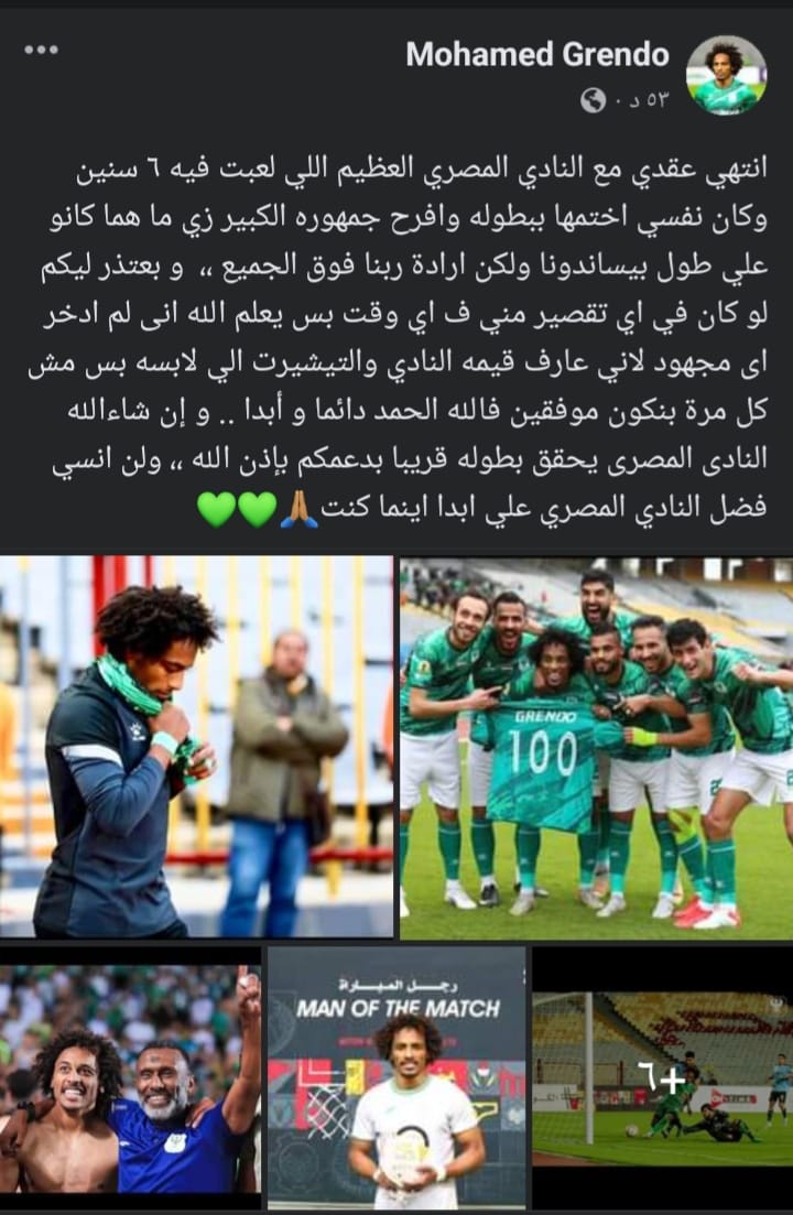 وجه الحساب الرسمي لنادى المصرى البورسعيدى، الشكر لنجم وهداف الفريق، محمد عبد اللطيف”جريندو”، عقب رحيله عن النسور الخضر خلال الانتقالات الصيفية الحالية وذلك بعد مسيرة امتدت ل6 مواسم كروية.