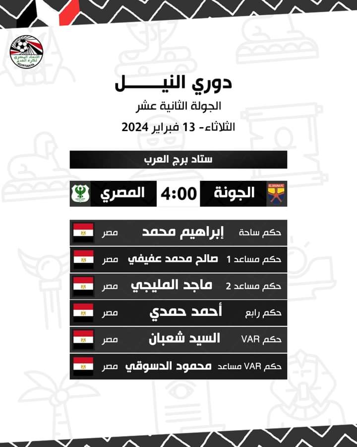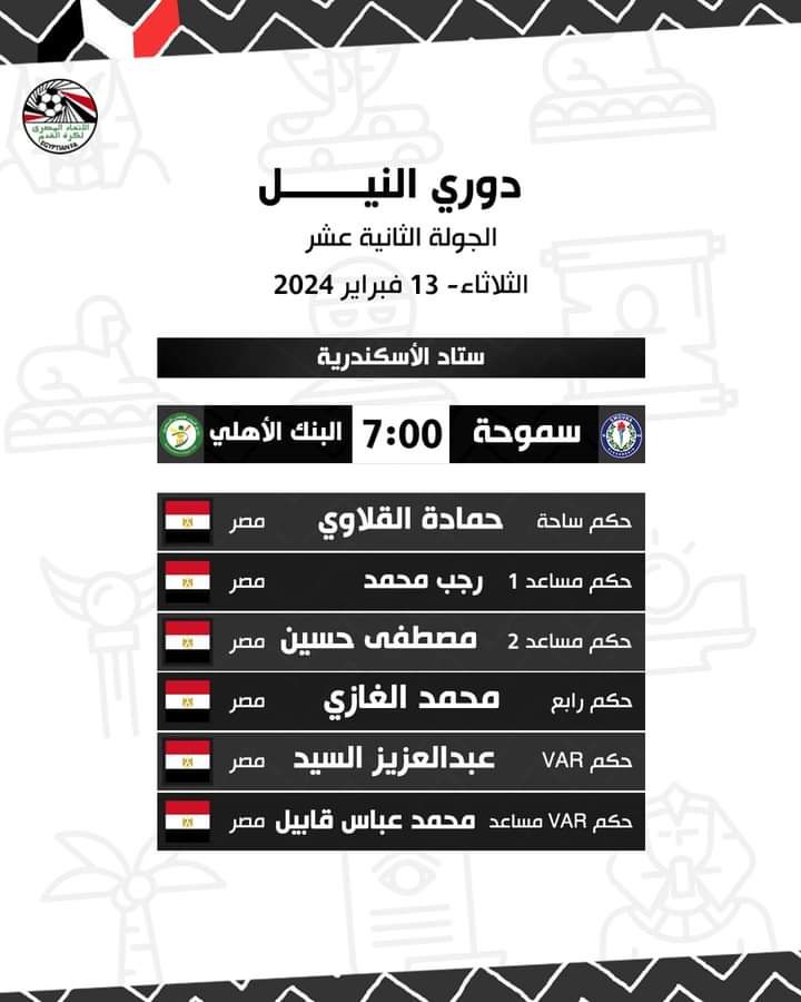 من جانبها، أعلنت لجنة الحكام، طاقمى مباريات اليوم الثلاثاء، من الجولة الـ12 لدوري النيل وهما: