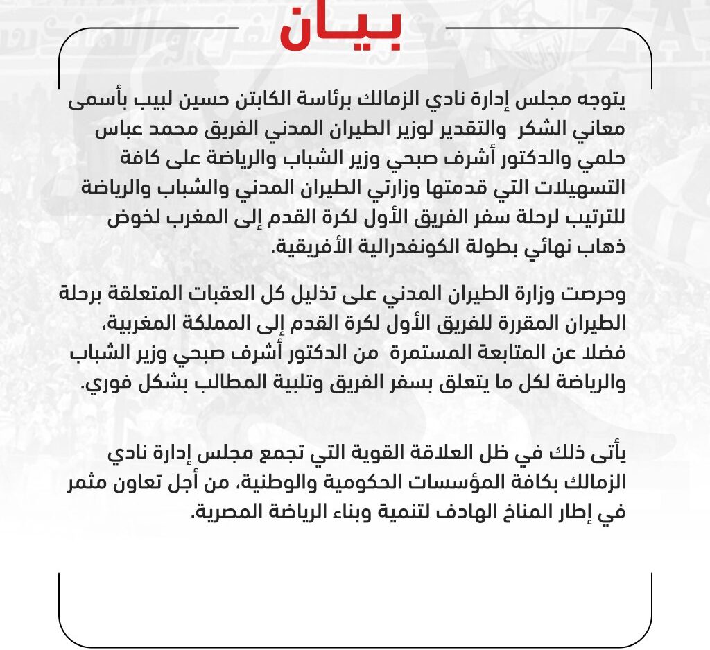 نهائي الكونفدرالية|بعثة الزمالك تطير إلى “وجدة” المغربية لملاقاة “نهضة بركان”