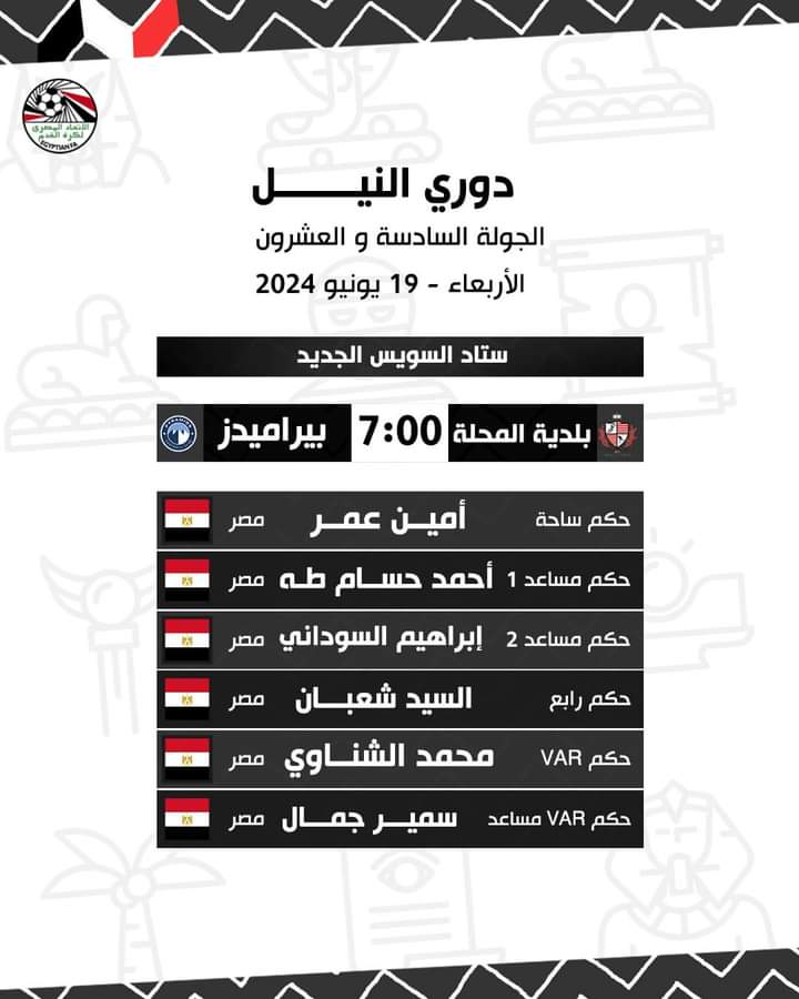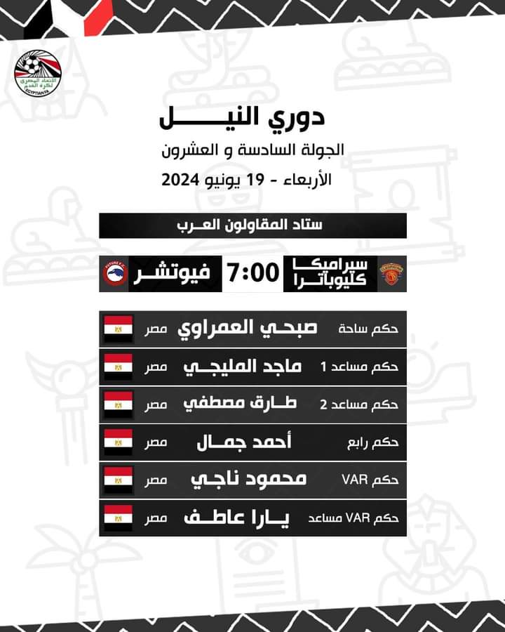 أما طاقمى حكام مباراتي اليوم الأربعاء، في الجولة السادسة والعشرين من دوري النيل فيديرهما: