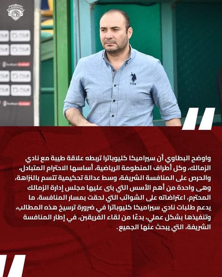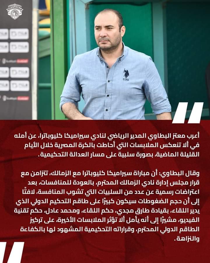 وقال سيراميكا فى بيانه: “معتز البطاوي المدير الرياضي لنادي سيراميكا كليوباترا، يعرب عن أمله في ألا تنعكس الملابسات التي أحاطت بالكرة المصرية خلال الأيام القليلة الماضية، بصورة سلبية على مسار العدالة التحكيمية في لقاء اليوم أمام الزمالك”.