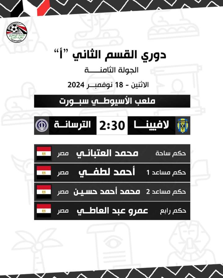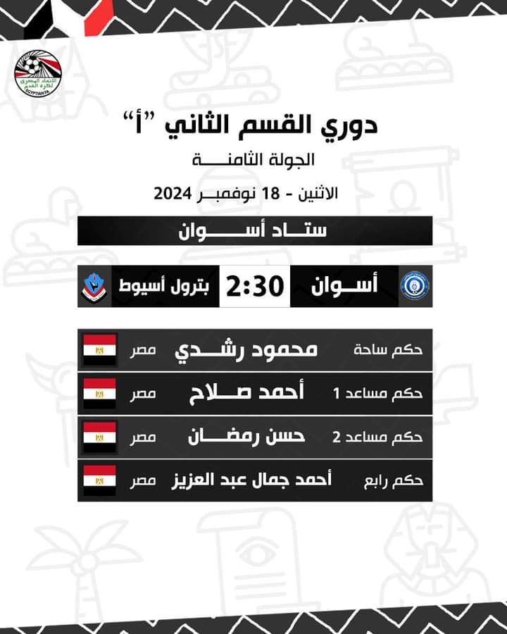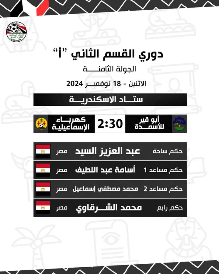 وإليكم أطقم حكام مباريات اليوم، في الجولة الثامنة من دوري القسم الثاني “أ”: