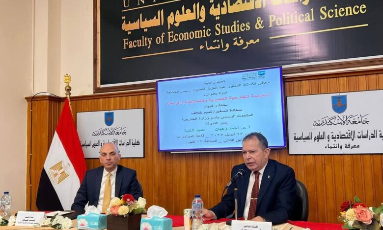 نظمت كلية الدراسات الاقتصادية والعلوم السياسية، اليوم، ندوة بعنوان: “السياسة الخارجية المصرية والمستجدات الراهنة “حاضر فيها السفير تميم خلّاف المتحدث الرسمي باسم وزارة الخارجية المصرية، وذلك بحضور لفيف من الأساتذة، وأعضاء هيئة التدريس، والهيئة المعاونة، والطلّاب من قسمي الاقتصاد والعلوم السياسية بالكلية.