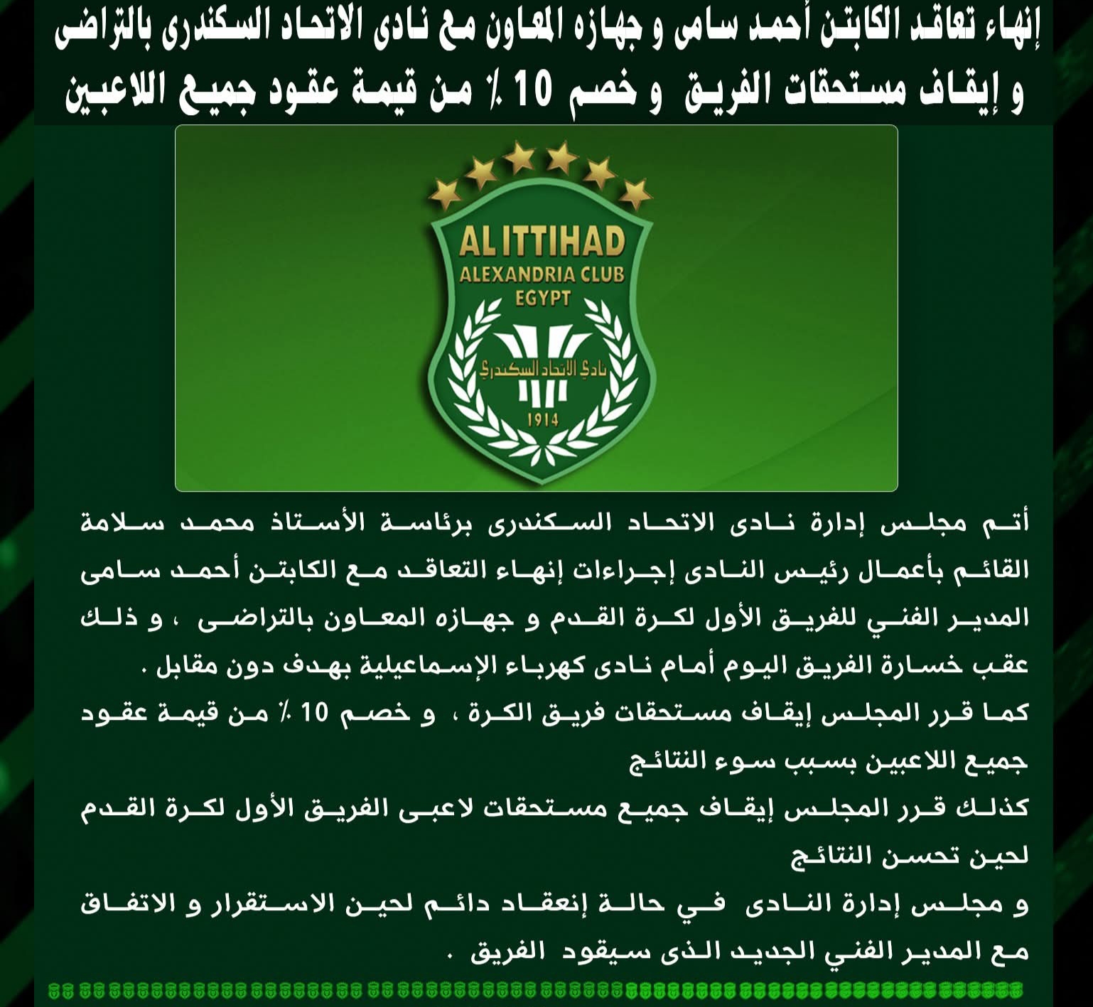 وأعلنت إدارة سيد البلد، إنهاء تعاقد أحمد سامى و جهازه المعاون مع نادى الاتحاد السكندرى بالتراضى، مع إيقاف مستحقات الفريق لحين تحسن نتائج الفريق و خصم 10 % من قيمة عقود جميع اللاعبين نتيجة سوء نتائج الفريق بالدوري هذا الموسم.