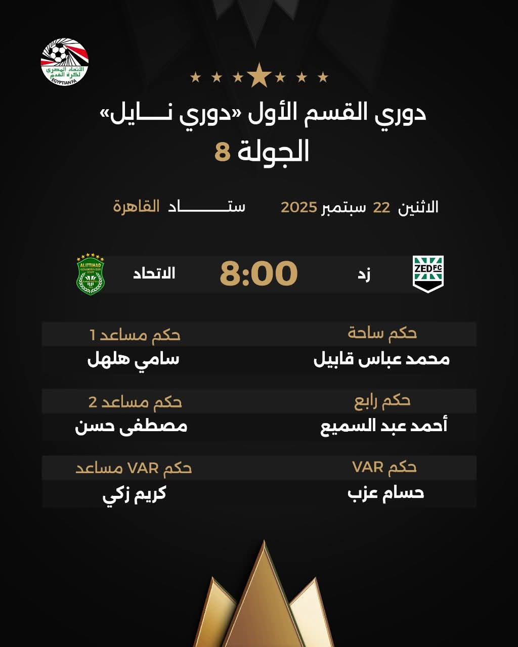 – زد × الاتحاد السكندري: محمد عباس قابيل (حكماً للساحة) ’ الدولي سامي هلهل ومصطفى حسن (مساعدين) ’ أحمد عبد السميع (حكماً رابعاً) ’ الدولي حسام عزب وكريم زكي (تقنية الفيديو).