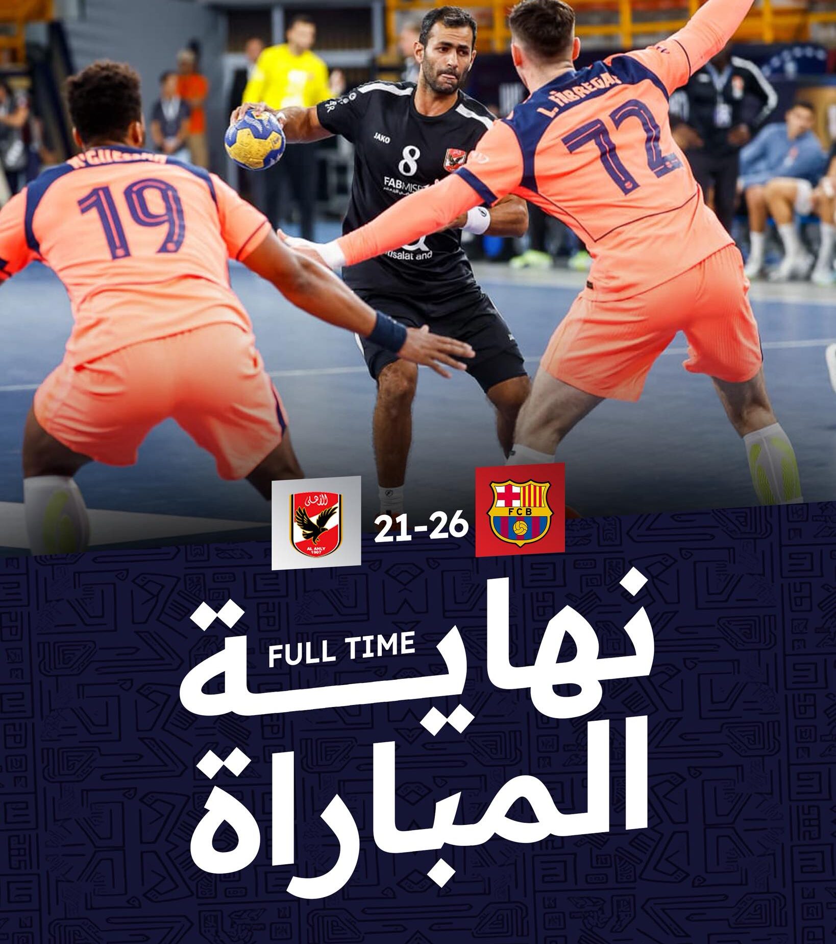 خسر الفريق الأول لكرة اليد رجال بالنادي الأهلي، المباراة المهمة من نظيره فريق برشلونة الإسباني التي أقيمت اليوم الثلاثاء، مع في نصف نهائي بطولة كأس العالم للأندية بفارق 5 أهداف وبنتيجة (26/21).