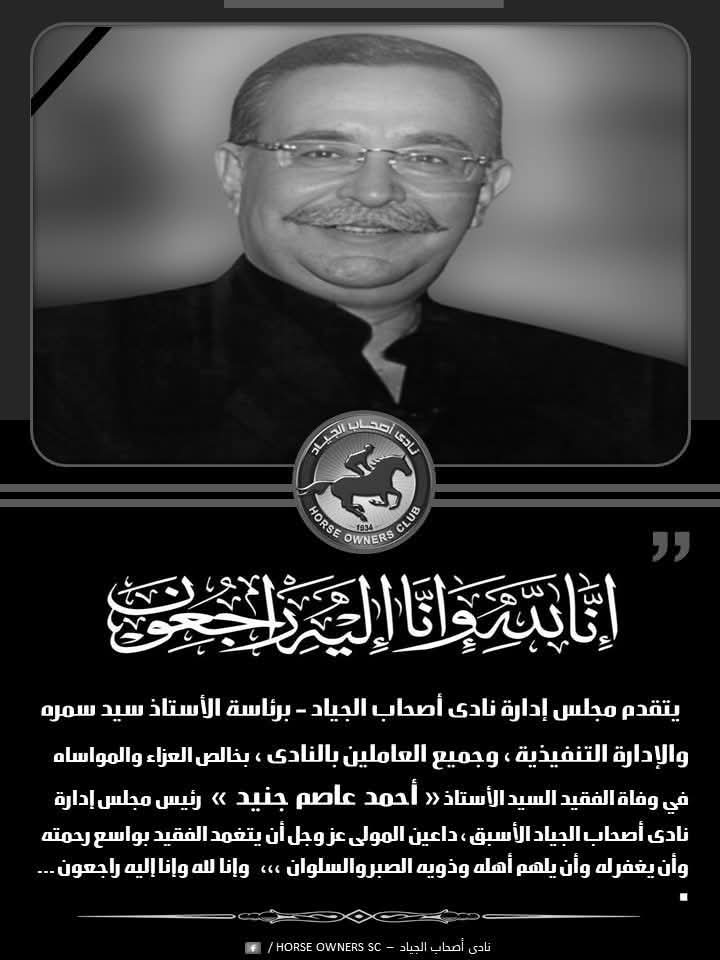 قرر مجلس إدارة نادى أصحاب الجياد برئاسة سيد سمره، إيقاف جميع الأنشطة الترفيهية والإحتفالية لمدة ثلاثة أيام، حداداً على روح الفقيد المرحوم، أحمد عاصم جنيد، رئيس مجلس إدارة نادى أصحاب الجياد الأسبق، تغمده الله بواسع رحمته، وألهم أسرته وذويه الصبر والسلوان، وإنا لله وإنا إليه راجعون.