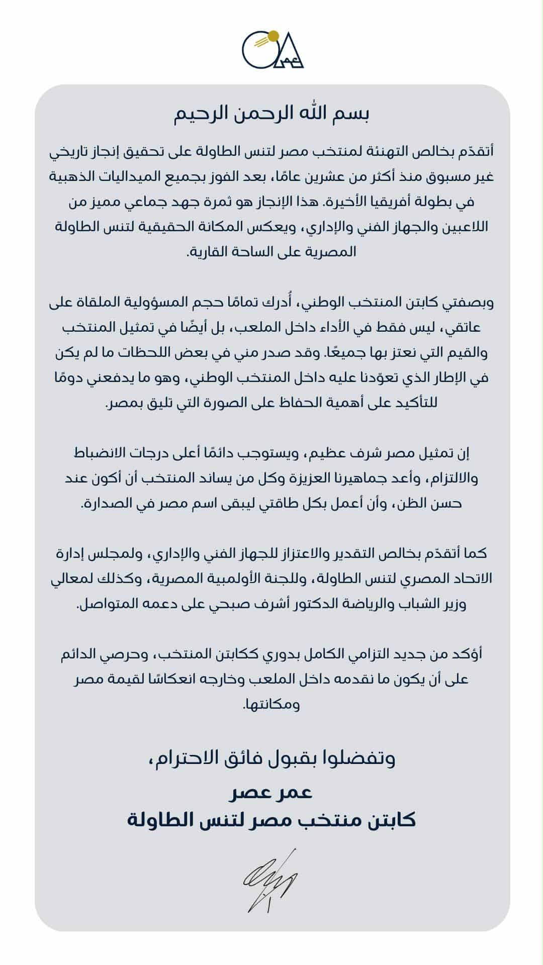 تقدم البطل المصري في تنس الطاولة، عمر عصر، بإعتذار رسمي إلي مسئولي الرياضة المصرية باللجنة الأوليمبية المصرية، ووزير الشباب والرياضة واتحاد تنس الطاولة المصري، علي مابدر منه مؤخراً خلال مشاركة بعثة المنتخب في بطولة إفريقيا للزوجي.