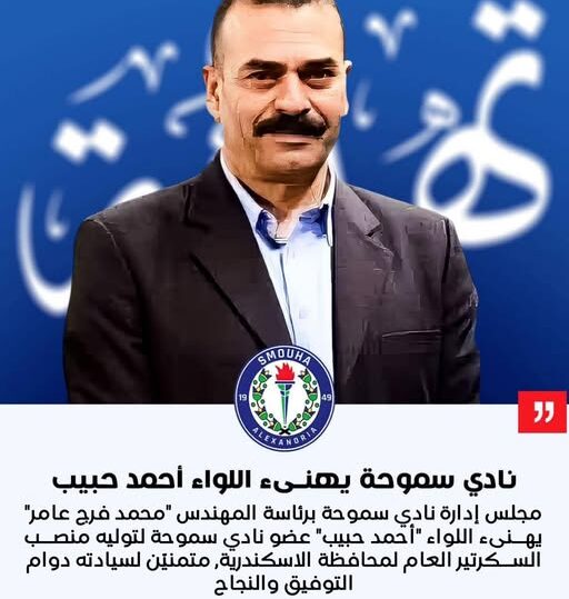 كتب-مصطفي عبد الناصر حرص مجلس إدارة نادي سموحة برئاسة المهندس "محمد فرج عامر"، علي تهنئة اللواء "أحمد حبيب"، عضو الجمعية العمومية لنادي سموحة، لتوليه منصب السكرتير العام لمحافظة الاسكندرية، متمنيّناً له دوام التوفيق والنجاح.