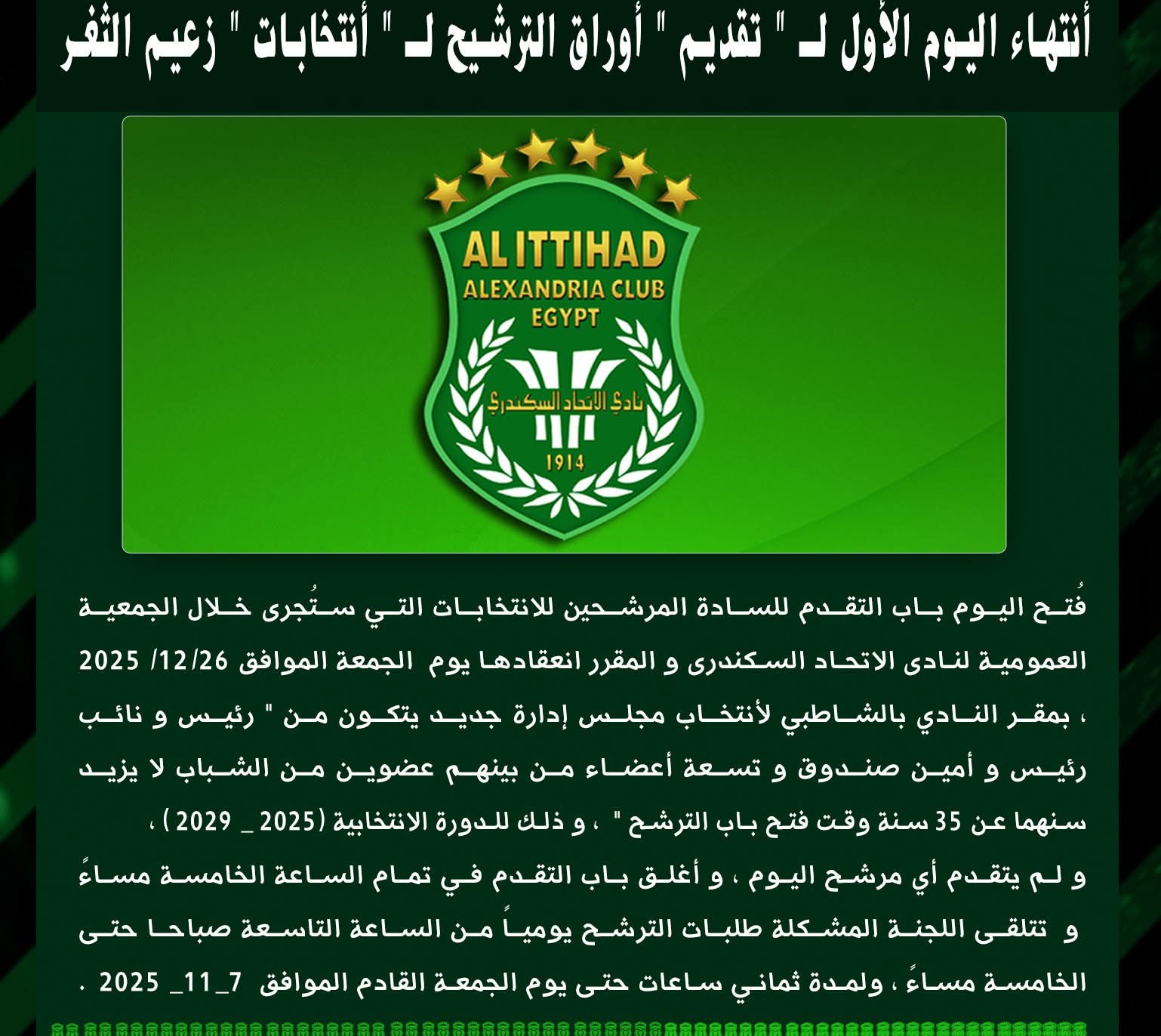 الاتحاد السكندري يواصل تلقي طلبات الترشح لانتخاباته و تحرك حافلة جماهيره للقاهرة