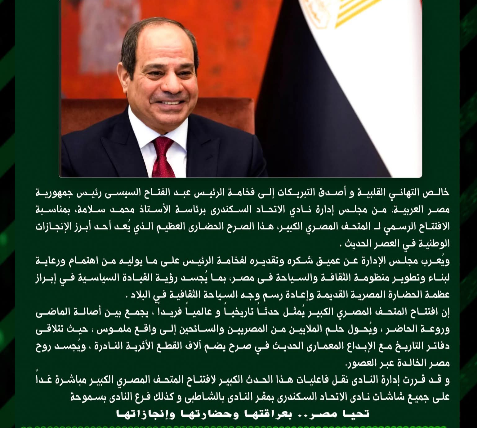 كذا حرصت إدارة النادي، علي توجيه التهنئة للرئيس السيسي بمناسبة افتتاح المتحف المصري الكبير وكذا مجلس إدارة النادي الأهلي الجديد برئاسة محمود الخطيب أيضاً بعد انتخابة لولاية جديدة (2025-2029).