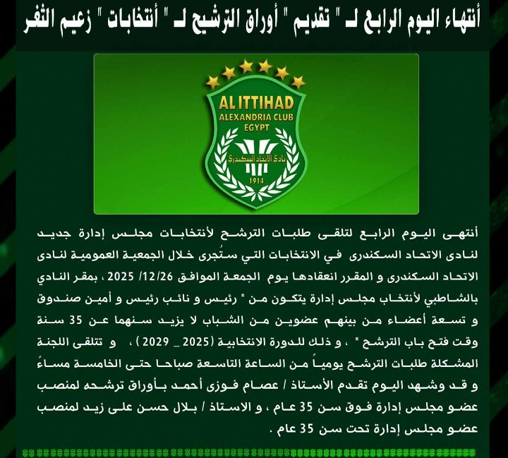 أعلنت إدارة نادي الاتحاد السكندري، منذ قليل انتهاء اليوم الرابع لتقديم أوراق الترشيح لأنتخابات “زعيم الثغر” للدورة 2025-2029.