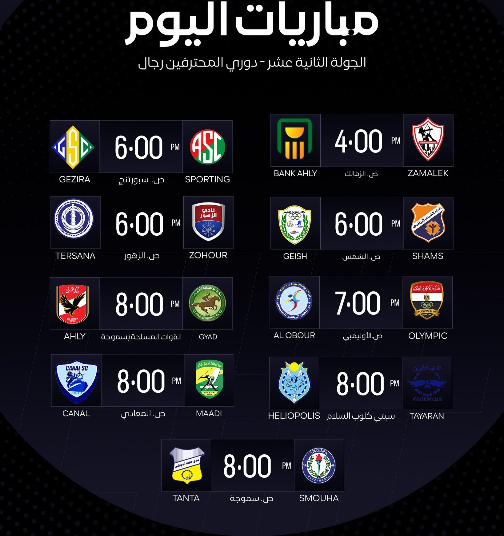 وتشهد مواجهات الجولة الـ 12 من دوري المحترفين لكرة اليد رجال، إثارة وندية في مبارياتها أبرزها: