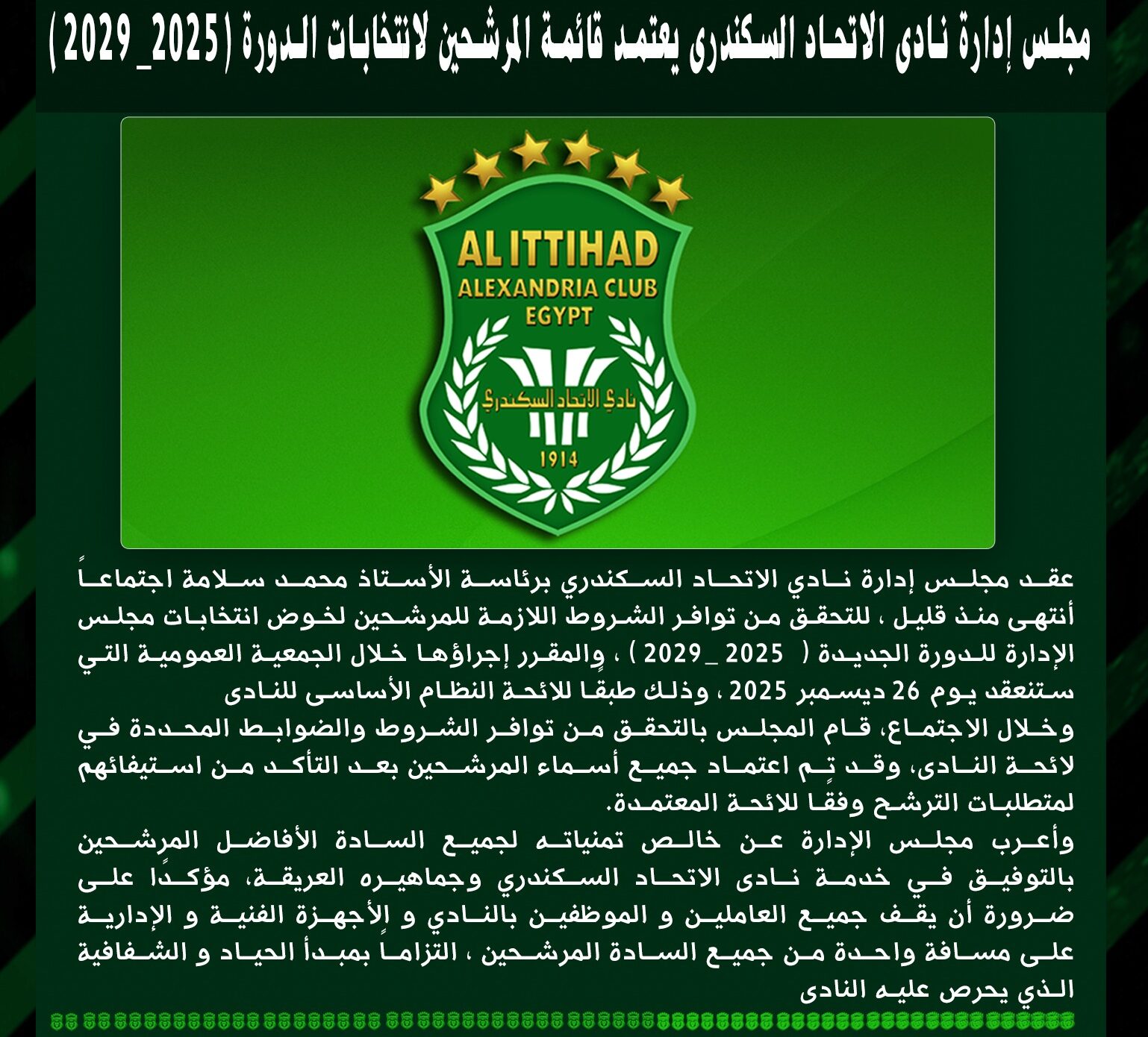 كتب-مصطفي عبد الناصر اعتمد مجلس إدارة نادى الاتحاد السكندرى، اليوم الأثنين، قائمة المرشحين لانتخابات الدورة (2025_2029 ) وذلك كالآتي:
