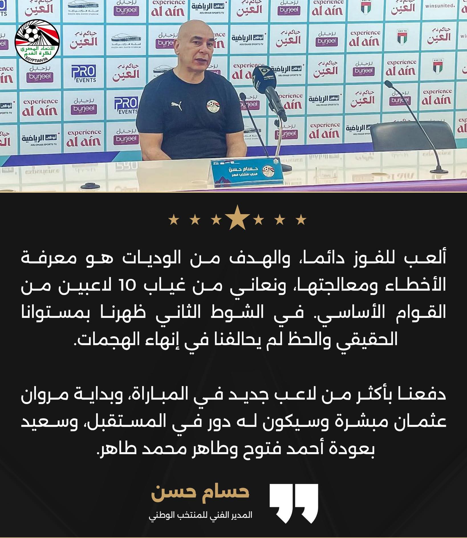 وأضاف حسن عقب مباراة أوزبكستان الودية، أنه رغم الخسارة، فإن الهدف الرئيسي من المباريات الوديات هو معرفة الأخطاء ومعالجتها، موضحًا أن لدى المنتخب الوطني الأول، غيابات عديدة أبرزها: محمد الشناوي ومحمد عبدالمنعم ومحمود حسن تريزيجيه وإبراهيم عادل وعمر مرموش وحمدي فتحي وإمام عاشور ومعظمهم لاعبون أساسيون، لكن رغم هذا، فهو لا يبرر الخسارة.