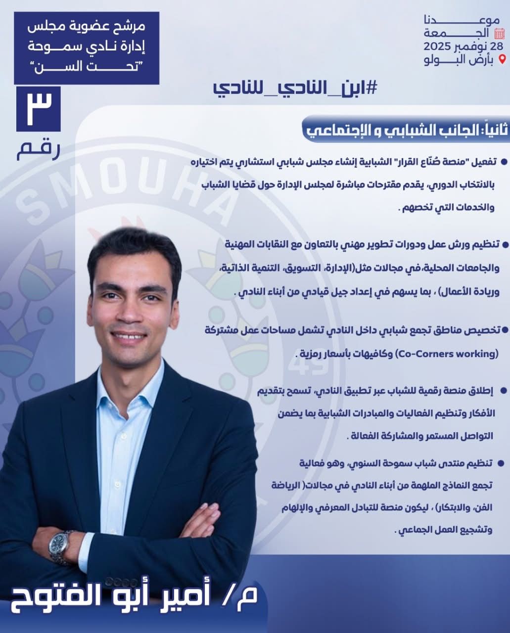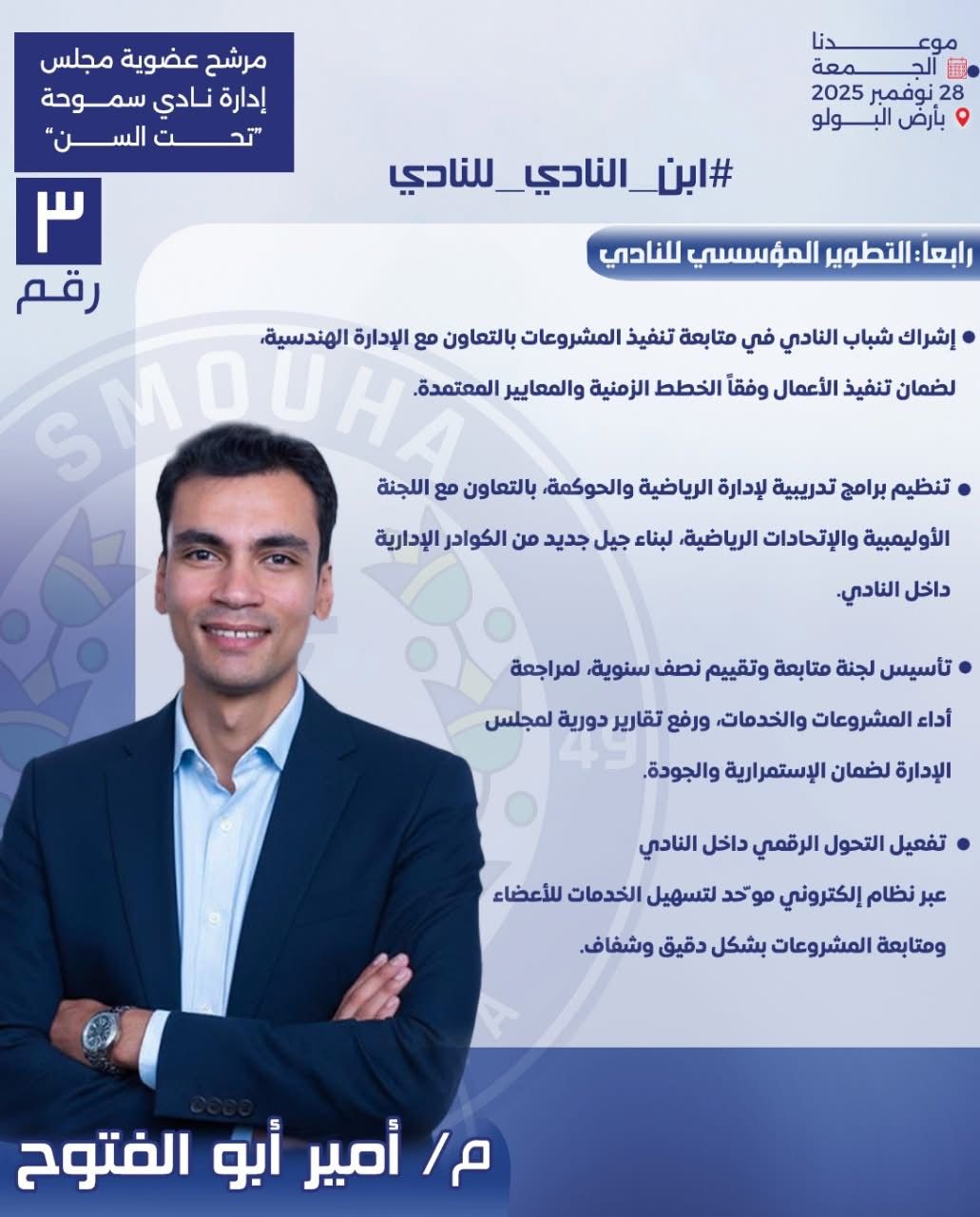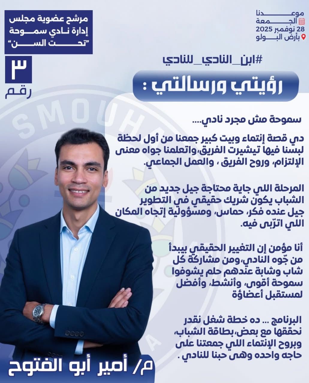 و العاصمة الثانية إذ تتطرق لسيرة وبرنامج أحد هؤلاء المرشحين ألا وهو المهندس أمير أبو الفتوح رقم 3 حاملاً شعار “ابن النادي للنادي” كصوت للشباب والذي يستند في برنامجه الانتخابي على عدة محاور أساسية، أبرزها: تطوير البنية التحتية والمرافق: الاستفادة من خبرته الهندسية لرفع كفاءة منشآت النادي. دعم الأنشطة الرياضية والثقافية: تخصيص موارد أكبر للفرق الرياضية المختلفة والاهتمام ببرامج الأسر والشباب. الشفافية والتواصل الفعال: إنشاء قنوات اتصال دورية ومباشرة بين مجلس الإدارة والأعضاء. إن الإقبال المتزايد على فعاليات المرشح والدعم الذي يحظى به، يؤكد أن أعضاء سموحة يتطلعون إلى جيل جديد من القيادات يحمل رؤية مستدامة لتطوير النادي العريق.