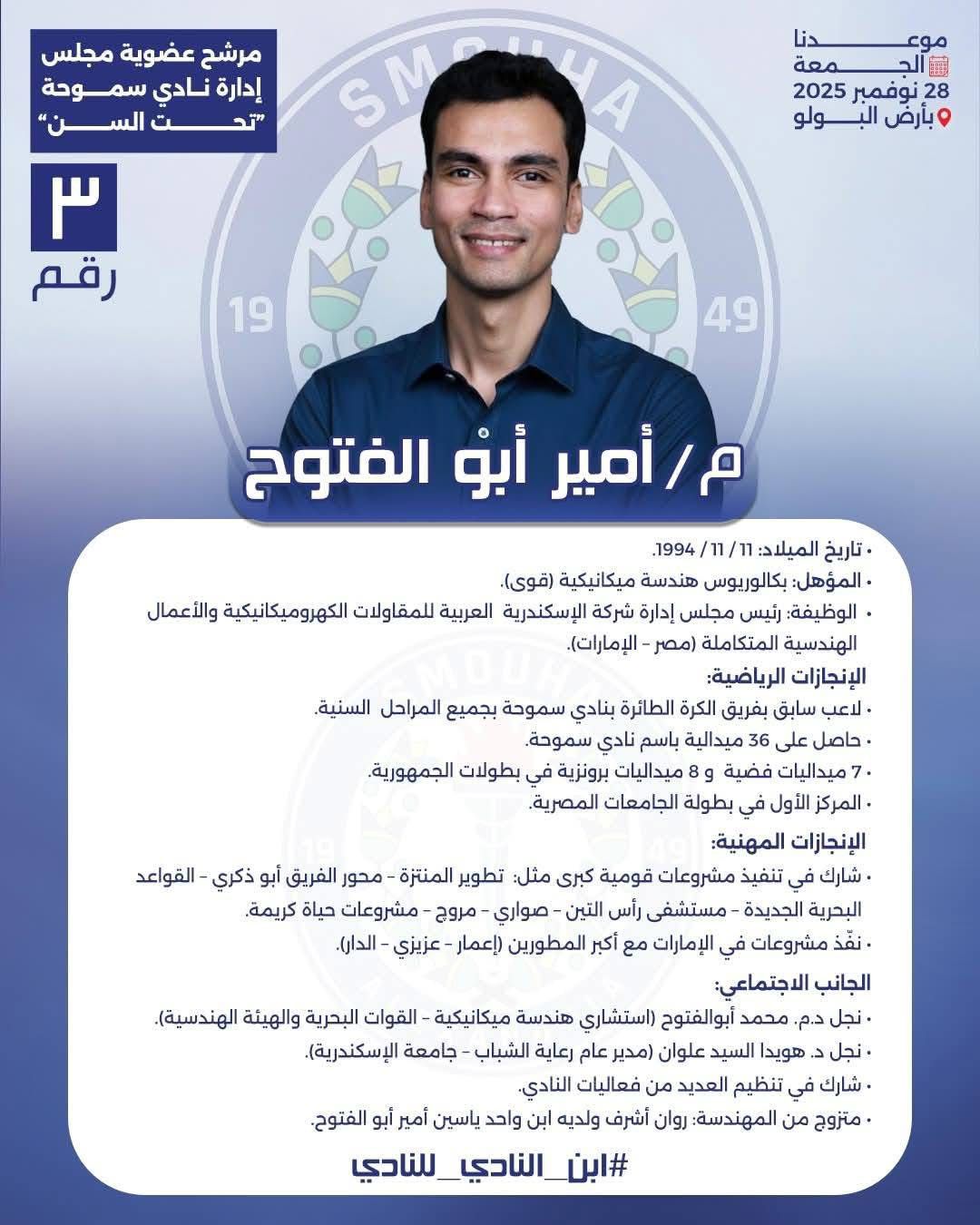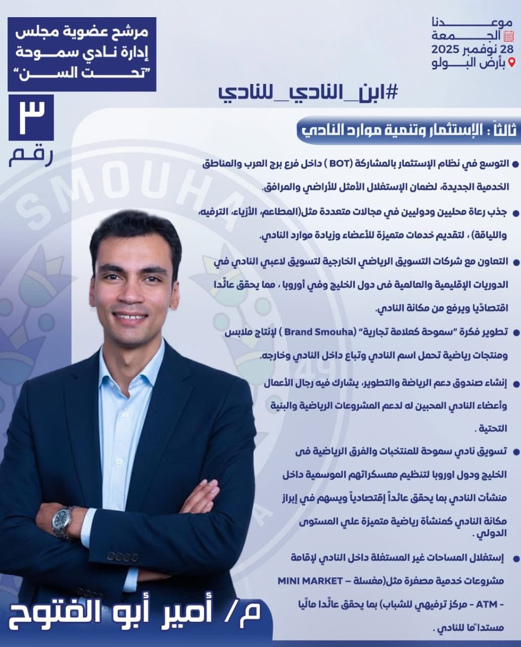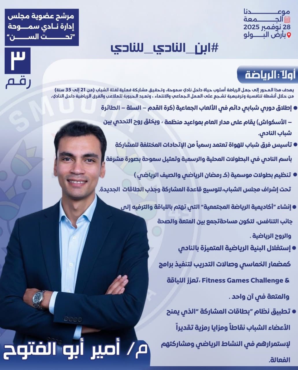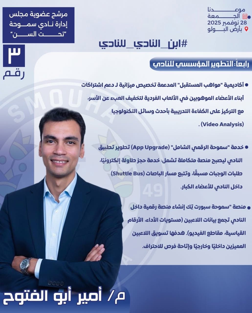 و العاصمة الثانية إذ تتطرق لسيرة وبرنامج أحد هؤلاء المرشحين ألا وهو المهندس أمير أبو الفتوح رقم 3 حاملاً شعار “ابن النادي للنادي” كصوت للشباب والذي يستند في برنامجه الانتخابي على عدة محاور أساسية، أبرزها: تطوير البنية التحتية والمرافق: الاستفادة من خبرته الهندسية لرفع كفاءة منشآت النادي. دعم الأنشطة الرياضية والثقافية: تخصيص موارد أكبر للفرق الرياضية المختلفة والاهتمام ببرامج الأسر والشباب. الشفافية والتواصل الفعال: إنشاء قنوات اتصال دورية ومباشرة بين مجلس الإدارة والأعضاء. إن الإقبال المتزايد على فعاليات المرشح والدعم الذي يحظى به، يؤكد أن أعضاء سموحة يتطلعون إلى جيل جديد من القيادات يحمل رؤية مستدامة لتطوير النادي العريق.