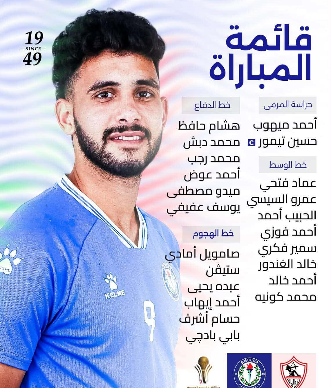 جاءت قائمة الزمالك كالتالي: “حراسة المرمى : محمد عواد – مهدي سليمان – محمود الشناوي.خط الدفاع : عمر جابر – محمود حمدي “الونش” – هشام فؤاد – بارون أوشينج – محمد إبراهيم.خط الوسط : محمود جهاد – سيف جعفر – السيد أسامة – أنس وائل – أحمد صفوت – أحمد عبد الرحيم “إيشو” – محمد حمد – ناصر ماهر– آدم كايد – أحمد شريف – خوان بيزيرا.خط الهجوم: ناصر منسي – عدي الدباغ – عمرو ناصر”.