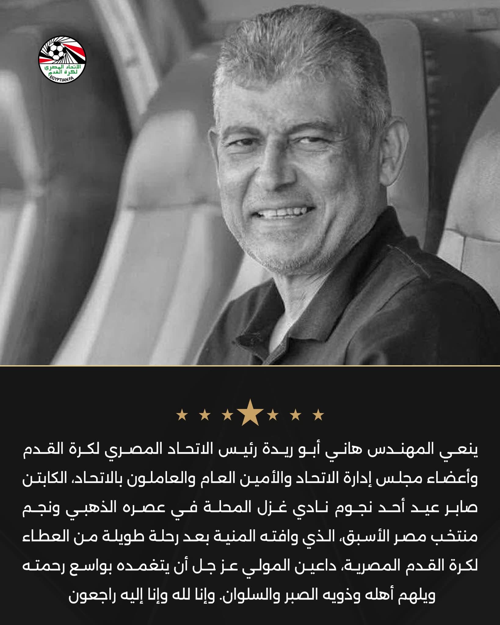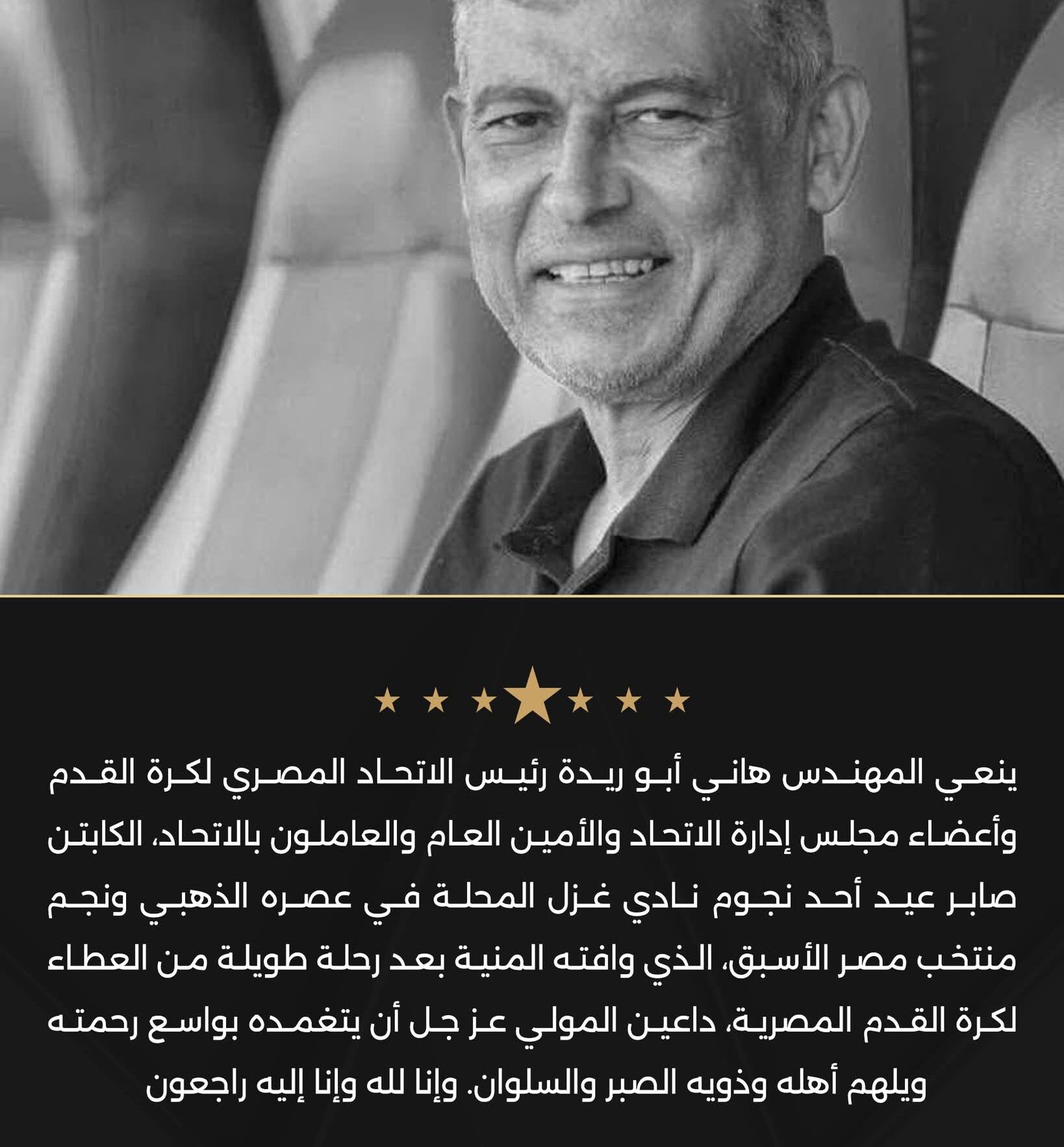 كذا نعي مجلس إدارة نادي الاتحاد السكندري،فقيد الكرة المصرية، صابر عيد، نجم نادي غزل المحلة و منتخب مصر السابق ببرقية عزاء مفادها: