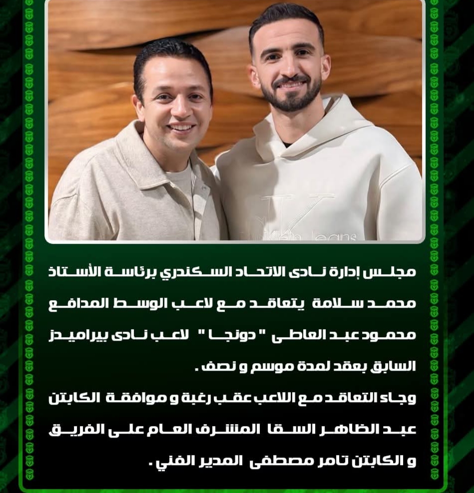 أعلن نادي الاتحاد السكندري، التعاقد مع ثان صفقاته الشتوية هذا الموسم بالتعاقد مع محمود عبد العاطى “دونجـا” لمدة موسم و نصف قادماً من صفوف بيراميدز.