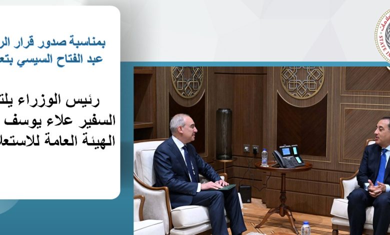 بمناسبة صدور قرار الرئيس عبد الفتاح السيسي، رئيس الجمهورية، بتعيينه رئيساً للهيئة العامة للاستعلامات، وصدور التشكيل الجديد لمجلس إدارة الهيئة..التقى الدكتور مصطفى مدبولي، رئيس مجلس الوزراء، السفير علاء يوسف.