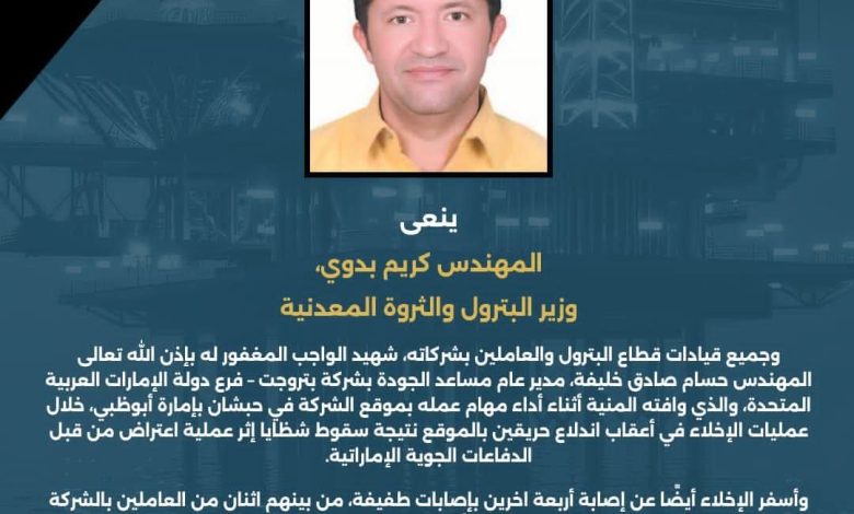 ينعي المهندس كريم بدوي، وزير البترول والثروة المعدنية، وجميع قيادات قطاع البترول والعاملين بشركاته، شهيد الواجب المغفور له بإذن الله تعالى المهندس حسام صادق خليفة، مدير عام مساعد الجودة بشركة بتروجت – فرع دولة الإمارات العربية المتحدة، والذي وافته المنية أثناء أداء مهام عمله بموقع الشركة في حبشان بإمارة أبوظبي، خلال عمليات الإخلاء في أعقاب اندلاع حريقين بالموقع نتيجة سقوط شظايا إثر عملية اعتراض من قبل الدفاعات الجوية الإماراتية.