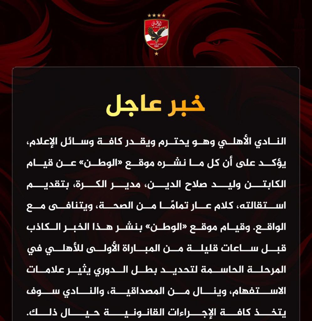 الأهلي يتخذ كافة الإجراءات القانونية تجاه موقع “الوطن سبورت”..وأنباء عن تحرك أهلاوي ضد مجلس الخطيب