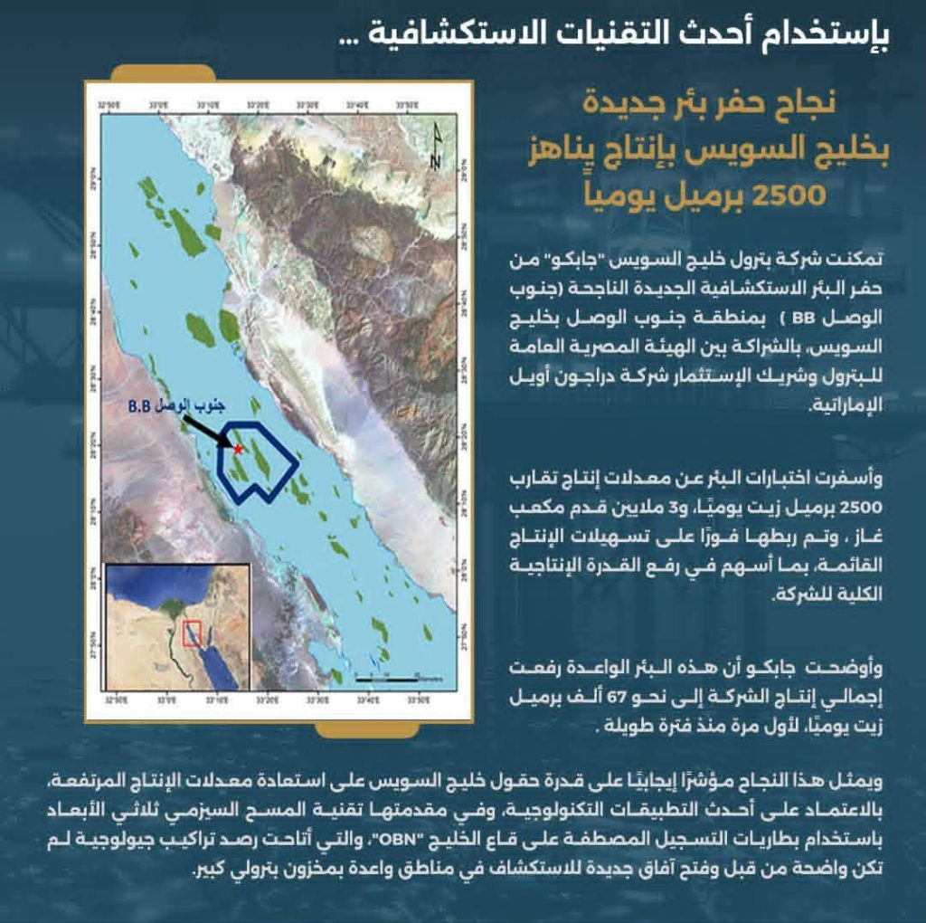 تمكنت شركة بترول خليج السويس “جابكو”، من حفر البئر الاستكشافية الجديدة الناجحة (جنوب الوصل BB) بمنطقة جنوب الوصل بخليج السويس، بالشراكة بين الهيئة المصرية العامة للبترول وشريك الإستثمار شركة “دراجون أويل” الإماراتية. وأسفرت اختبارات البئر، عن معدلات إنتاج تقارب 2500 برميل زيت يوميًا، و3 ملايين قدم مكعب غاز، وتم ربطها فورًا على تسهيلات الإنتاج القائمة، بما أسهم في رفع القدرة الإنتاجية الكلية للشركة.