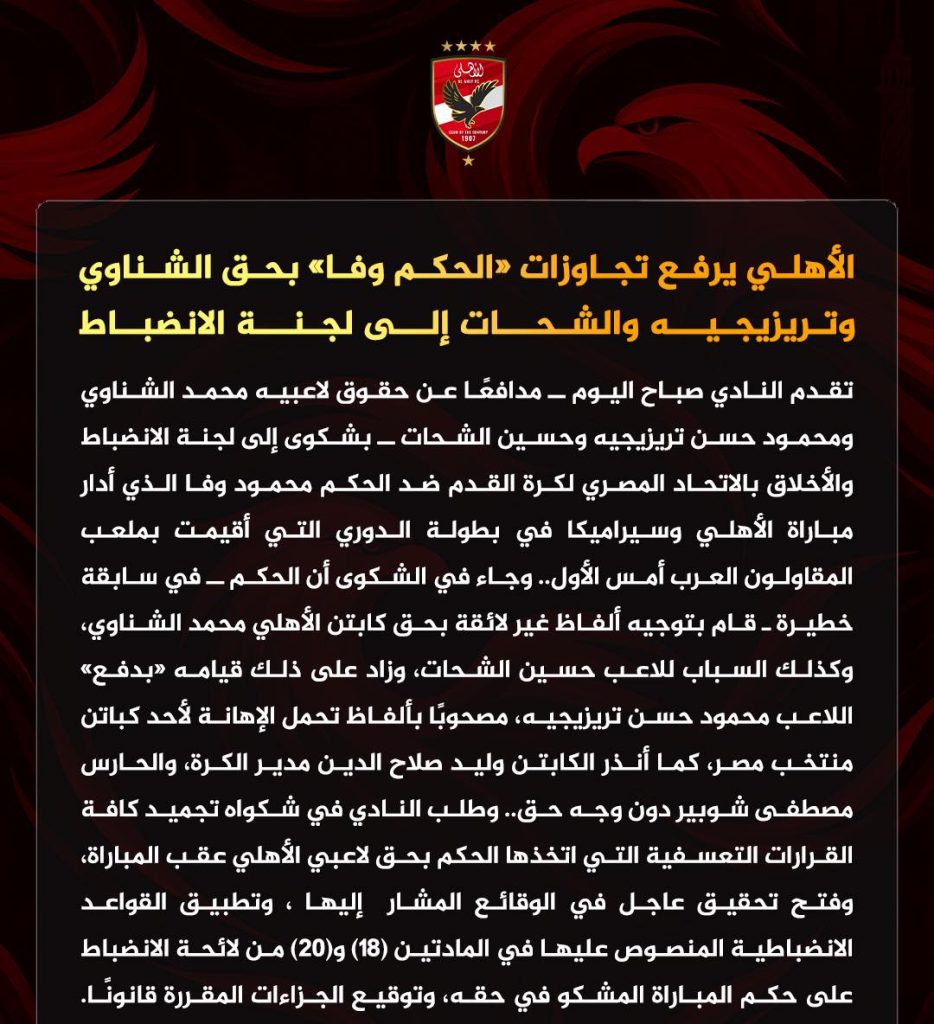 تقدم النادي الأهلي صباح اليوم الخميسـ مدافعًا عن حقوق لاعبيه: محمد الشناوي، ومحمود حسن تريزيجيه، وحسين الشحات ـ بشكوى إلى لجنة الانضباط والأخلاق بالاتحاد المصري لكرة القدم ضد الحكم، محمود وفا الذي أدار مباراة الأهلي وسيراميكا في بطولة الدوري التي أقيمت بملعب المقاولون العرب أمس الأول.