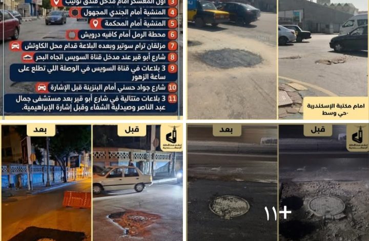 ترميم الحفر بالأسفلت ومحيط مطابق الصرف الصحي بنطاق حي وسط بطريق قناة السويس المتجه إلى ساعة الزهور طريق قناة السويس اتجاه البحر أمام مكتبة الإسكندرية بطريق الكورنيش بشارع جواد حسني ترميم محيط مطابق الصرف الصحي بنطاق حي الجمرك أمام الجندي المجهول أمام محكمة المنشية