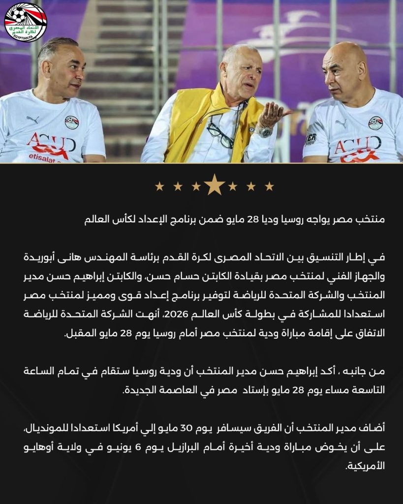 أنهت الشركة المتحدة للرياضة، الإتفاق على إقامة مباراة ودية لمنتخب مصر أمام روسيا يوم 28 مايو المقبل، وذلك في إطار التنسيق بين الاتحاد المصرى لكرة القدم برئاسة، المهندس هانى أبوريدة، والجهاز الفني لمنتخب مصر بقيادة حسام حسن، و إبراهيم حسن، مدير المنتخب، والشركة المتحدة للرياضة؛ لتوفير برنامج إعداد قوى ومميز لمنتخب مصر استعدادا للمشاركة في بطولة كأس العالم 2026.