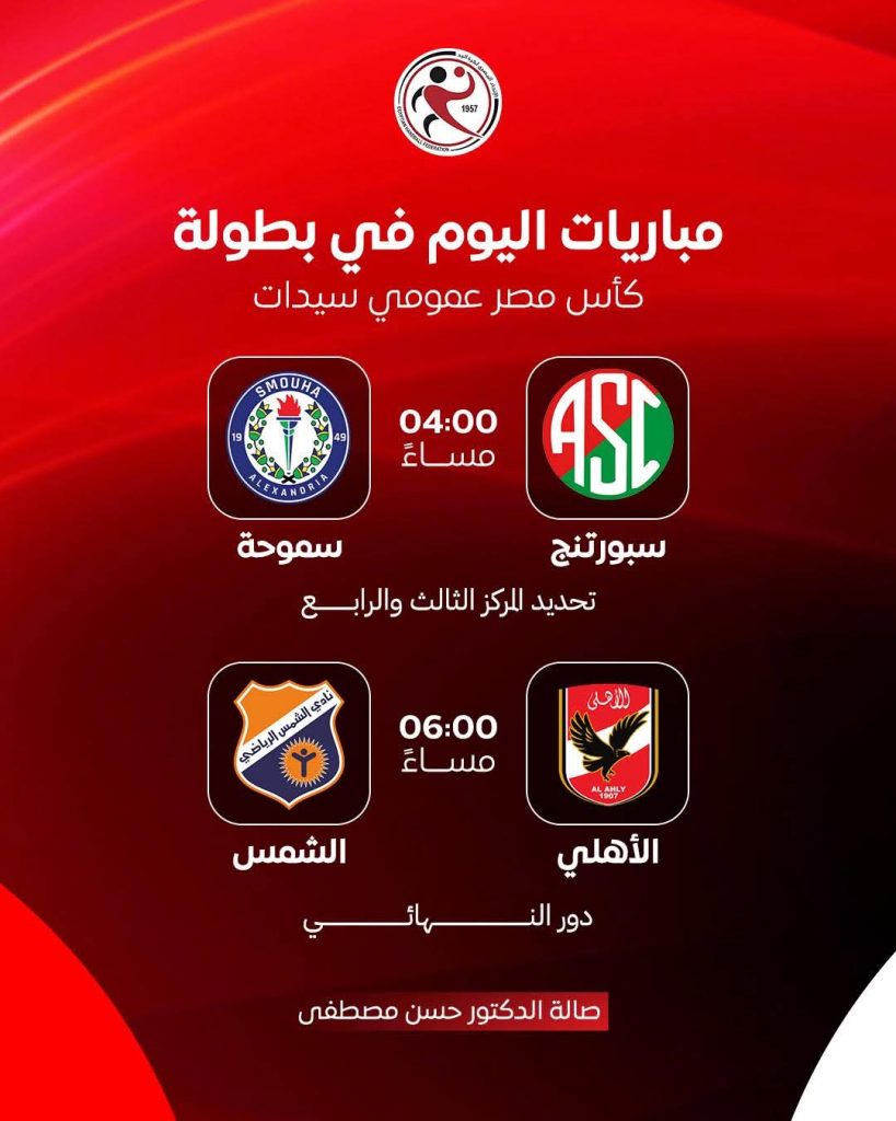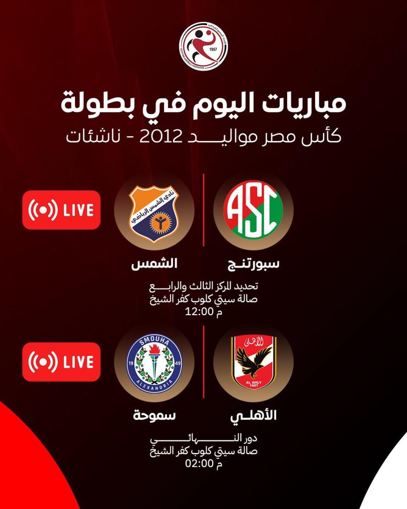 في سياق متصل، أعلن اتحاد كرة اليد المصري مواعيد مباريات اليوم في كأس مصر للناشئات مواليد 2012 وجاءت كالتالي: