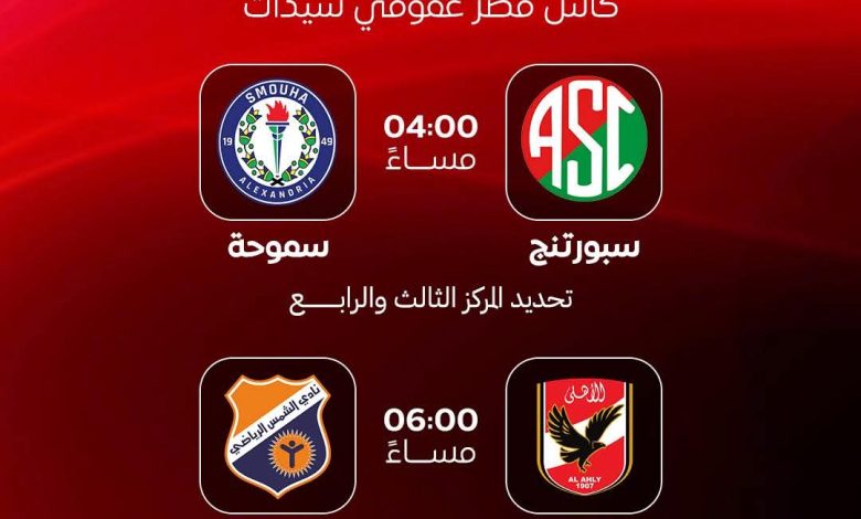 علي أن يسبقها في الرابعة عصراً مباراة الميدالية البرونزية وتحديد المركز الثالث بين ثنائي إسكندرية سبورتنج وجاره سموحة.