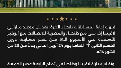 كتب-مصطفي عبد الناصر إعادة مباراة طنطا والمصرية للاتصالات.. وعقوبات مالية وإدارية تعديل موعد مباراتى طنطا والاتصالات في الجولة 31 بدورى…