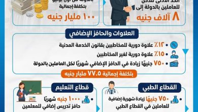 كتب-مصطفي عبد الناصر اعلن أحمد كجوك، وزير المالية خلال المؤتمر الصحفي لمجلس الوزراء، زيادة أجور العاملين بالدولة اعتباراً من اول…